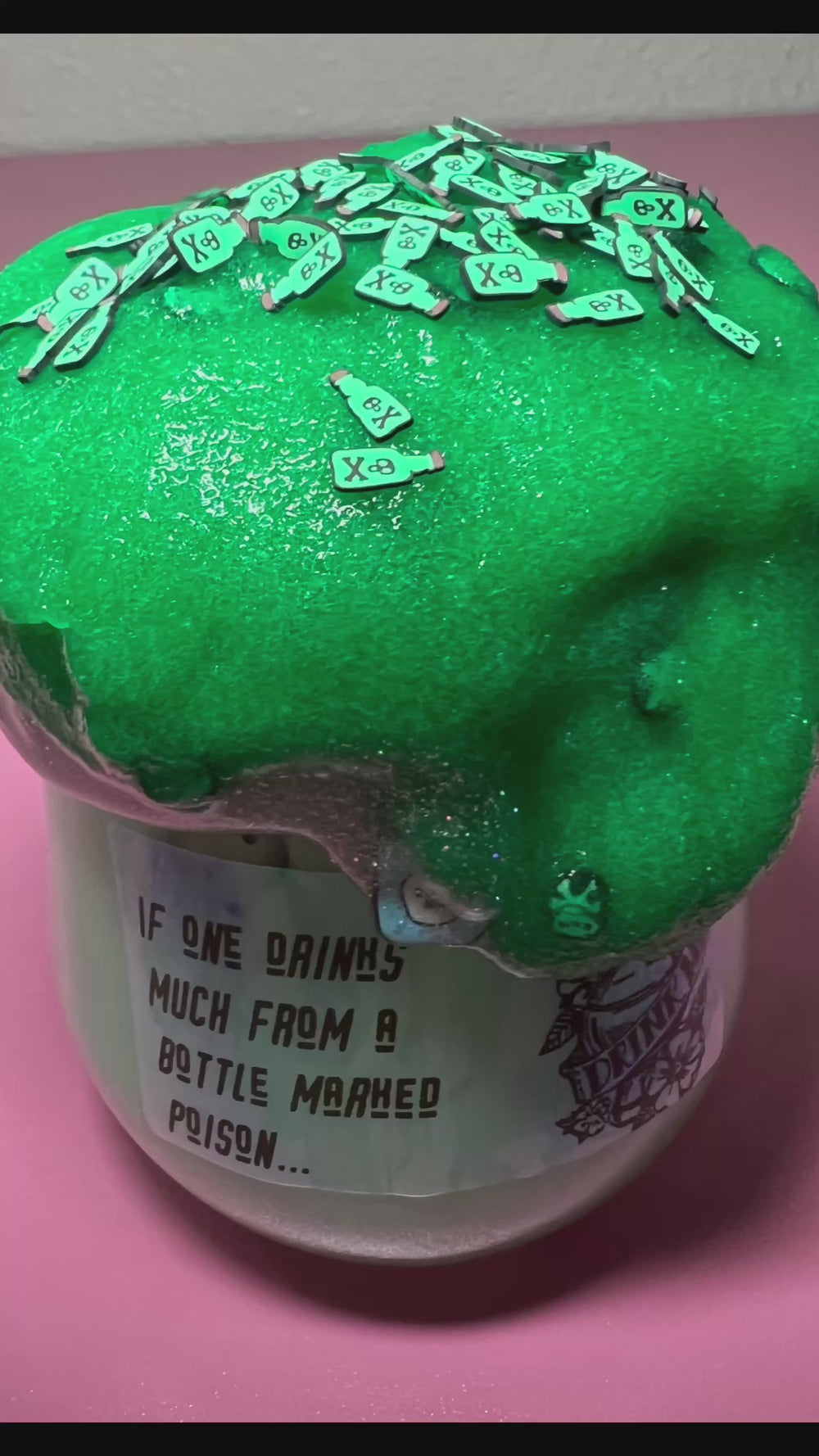 For this specific slime, I wanted to portray it as what Alice names it - poison. So this is a white glue, green slime with giant skull black and white glitter, topped with tempting iridescent layer with drink me fimos, with a swirl of green jelly filled with skull and cross bone fimos. It’ll also include poison bottle fimos for you to sprinkle on ✨☠️✨