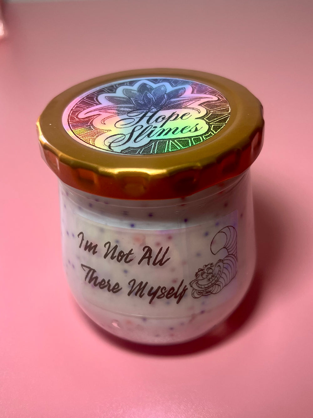 This is a glittery, white thick and glossy, multi-floam slime. The big and small floam beads represent the Cheshire Cat’s fur, while the white, thick and glossy base represents the way he mysteriously disappears! 🙀🌀