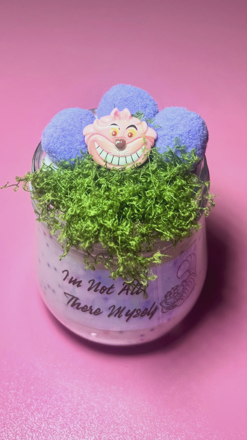 6oz glass jar of slime with toppers and charm. Please do not mix in the fake moss and pompoms, those are just for decor! They end up gumming up the slime, so be careful!